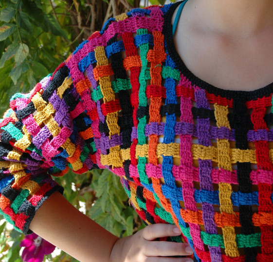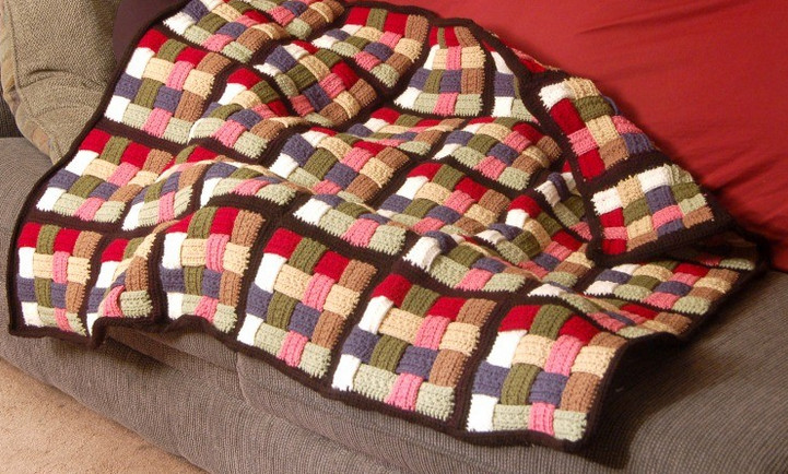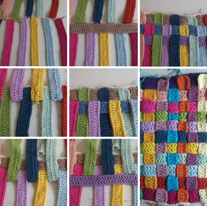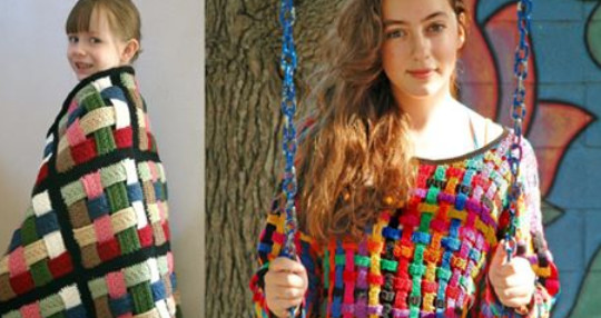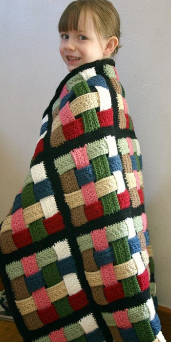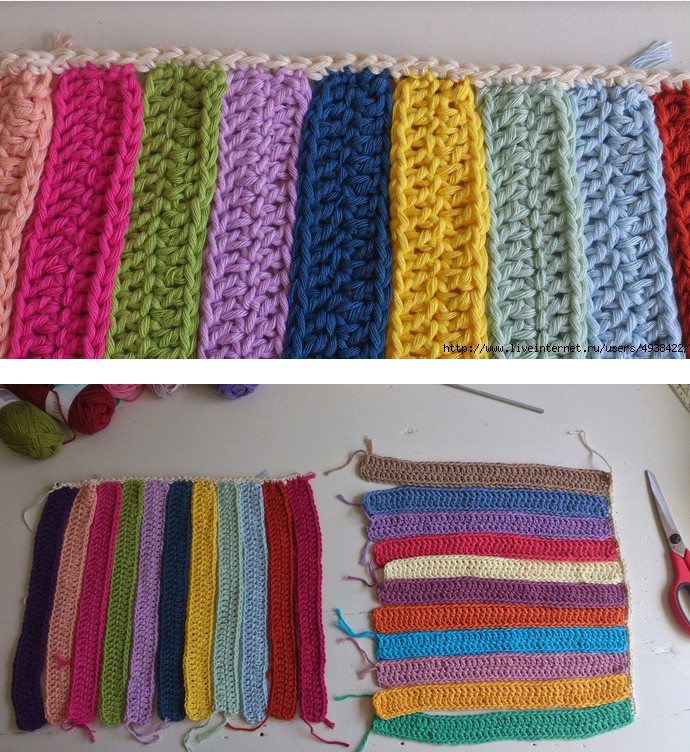 Сегодня поговорим о создании вещей из переплетенных вязаных полосок. Таким образом можно создать простой и нарядный плед. Это будет теплый плед — он получается двойным. И красочным, ярким. Получаются оригинальные и яркие вещи!