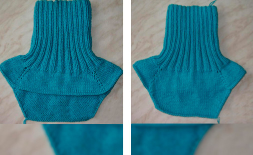 9 р.: *прот., 2 л. п., н., 4 л. п., н., 1 л. п. за задн. стен., н., 4 л. п., н., 2 л. п., 2 п. вм. л., н., двойное убавление, н., от *.