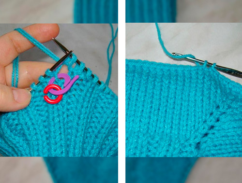 Набрать на спицы 16 (22) 30 п. и вязать следующим образом: 4 п. каймы с пико, прикрепить маркер, 11 (17) 25 п. платочной вязкой, кромочная.