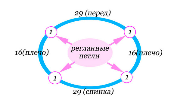 - Для того, чтобы горловину можно было свободно надевать и снимать без деформирования, классический вариант предусматривает растягивание манишки на 50 см. Таким образом, количество петель должно быть в районе 60 штук. Вязание регланом предполагает численность петель кратную четырем, поэтому прибавляем еще восемь петель. Регланные петли лучше отметить маркерами, яркими нитями или булавками согласно этой схеме: