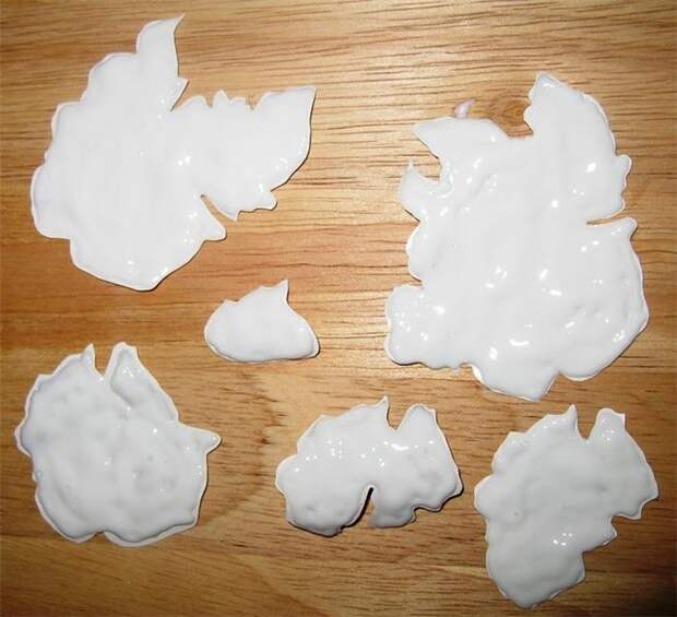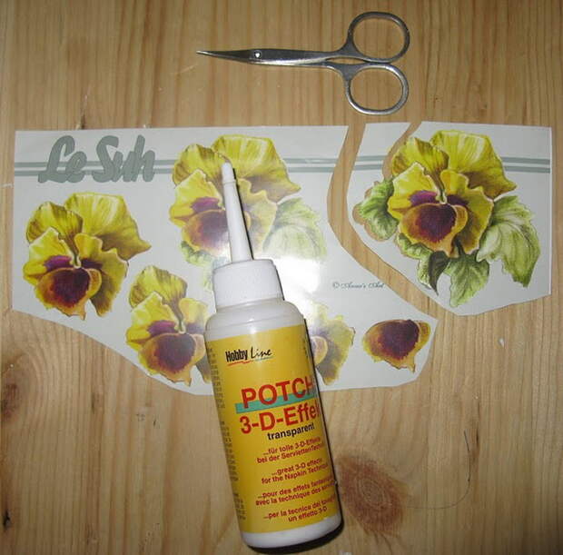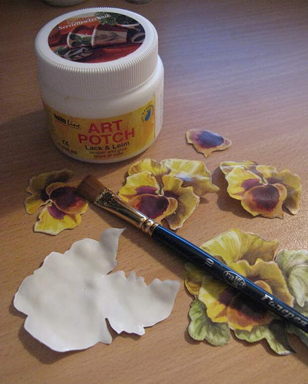 4.После высыхания геля, начинаем собирать цветочек. Первый основной элемент цветка просто кладем на стол. Рекомендую использовать полиэтиленовый пакет, чтобы не замарать рабочую поверхность стола. Второй элемент - с изнанки намазываем клеем для декупажа и прикладываем сверху, чтобы рисунок совпадал (на фото первый+второй элемент)