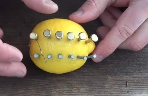 С помощью медных и цинковых электродов, роль которых выполняют гвозди, из лимона получается настоящая батарея. Благодаря химическим реакциям, происходящим между лимонным соком и металлами, на электродах появляется разность потенциалов. Никаких чудес, сплошная наука!