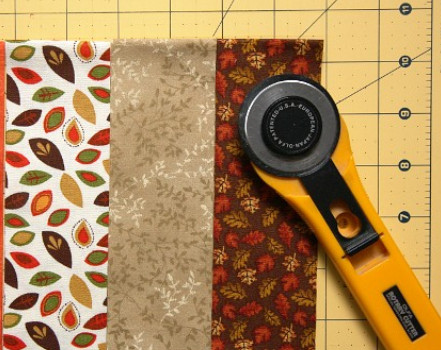 Размещаем сшитые между собой полосы на коврике таким образом, чтобы край полос совпадал с линиями разметки. При помощи линейки, ножа и коврика, отрезаем лишнее и нарезаем полосы на квадраты. Для создания этого блока, нам понадобится 4 квадрата.