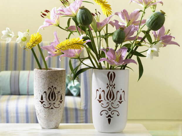 Идея-2: наклейки и рисунки Если у вас есть заброшенная однотонная ваза с гладкой поверхностью, ее можно украсить тонким рисунком: с помощью трафарета или наклейками.