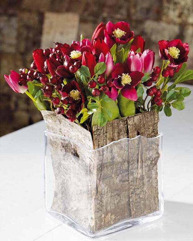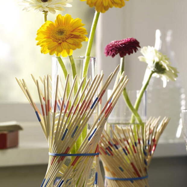 Идея-5: природные материалы Бамбуковые палочки и салфетки, деревянные шампуры и натуральная пенька, кора деревьев и фрагменты старой решетки - все это станет необычным украшением вазы, если вам нравится эко-стиль.