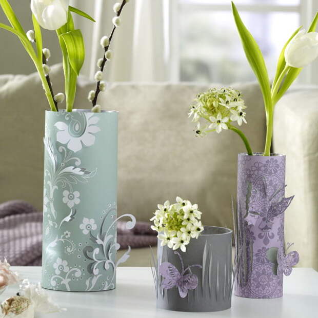 Идея-4: бумага и картон Идеи из упаковочной и просто цветной бумаги, как правило, делятся на простые и сложные. А если вы владеете техникой квиллинга (не путать с квилтингом!), имеются ввиду “завитки” из специальной бумаги, - значит, ваши вазы могут стать настоящим произведением искусства.