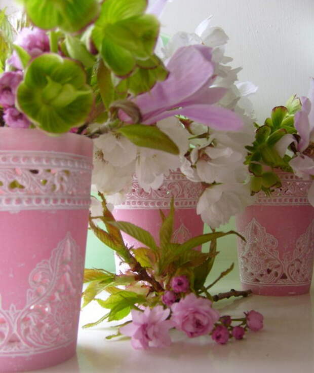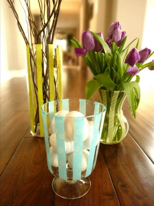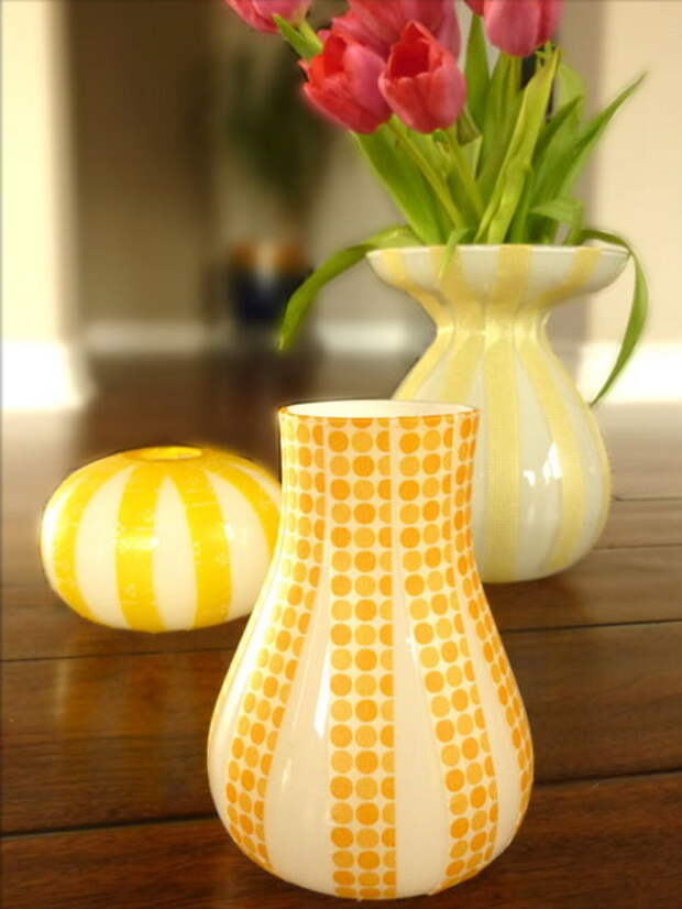Эта идея эффектно смотрится и на прозрачных стеклянных вазах. Рисовать можно акриловыми матовыми красками или оттенками металлик (золото, серебро, бронза). Еще одна эффектная идея, не показанная здесь: крепление к стеклянной вазе полосок из страз, собранных на клеящую ленту. Если вам встретится подобное украшение в магазинах для швей, - попробуйте использовать его для украшения вазы, смотрится сногсшибательно.