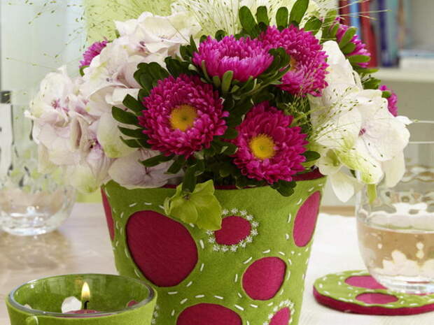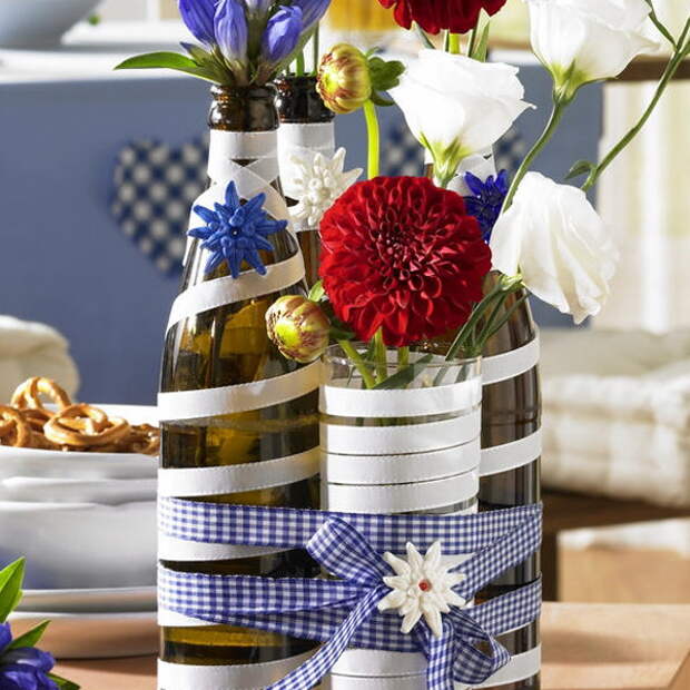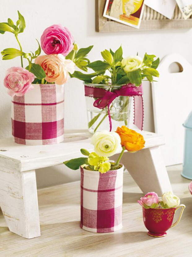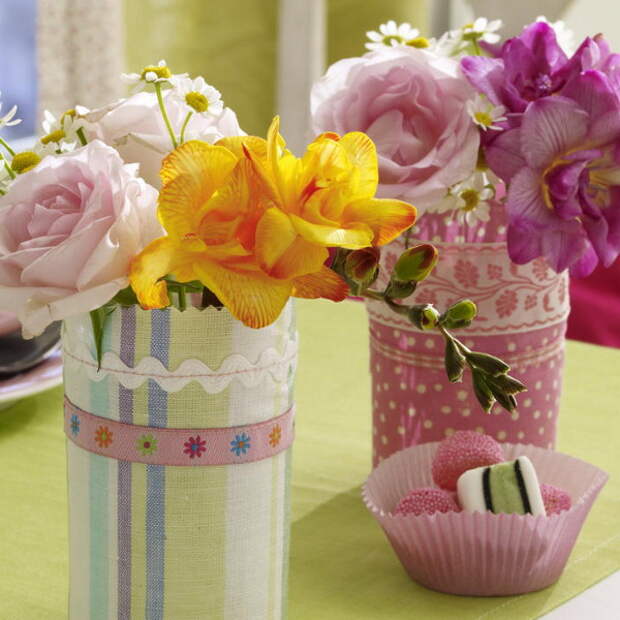 Идея-3: ткани и ленты В зависимости от типа ткани и рисунка можно создать совершенно разное настроение для вазы, которое будет идеально совпадать со стилем букета. Посмотрите, насколько разнообразны решения.