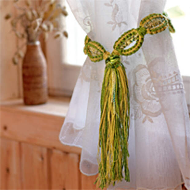 3. Для боковых «дорожек» основной цвет теперь будет желтый. Точно так же выполните остальные «звенья» этой части подхвата. Затем сплетите еще одну точно такую же заготовку, повторив описанные в п. 1–4 действия. Соедините заготовки вместе, выполнив несколько плоских узлов. Оставшиеся концы нитей пусть образуют кисть. Пришейте пуговицу. Подхват для штор своими руками.