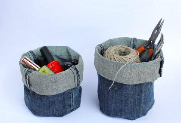 Корзинки-органайзеры! Из пластиковой бутылки и джинсов легко смастерить такие облегчающие быт вещицы.