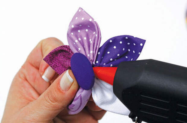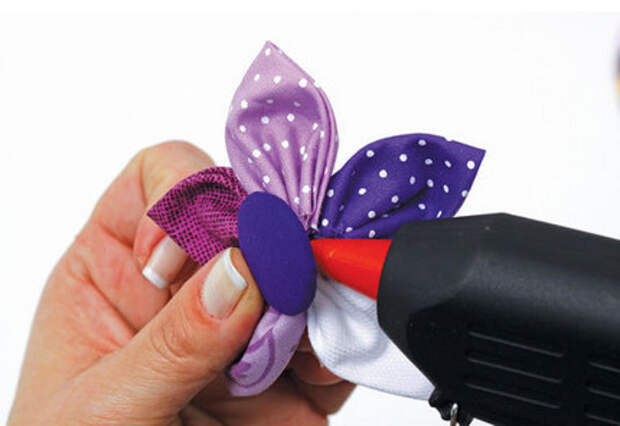 С помощью горячего клея приклеиваем лепестки к обратной стороне пуговицы (можно заранее сделать подкладку для задней части, для удобства и большей эстетики):