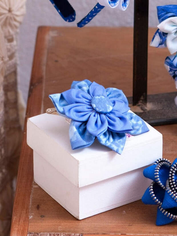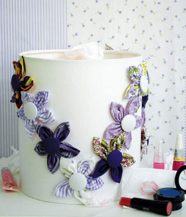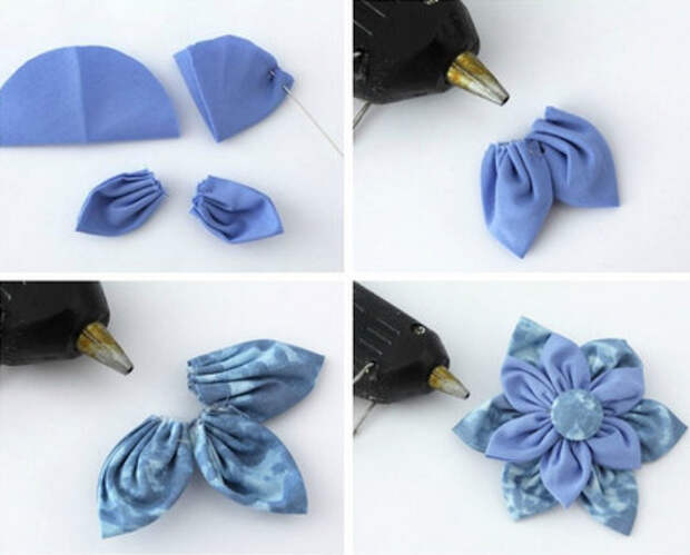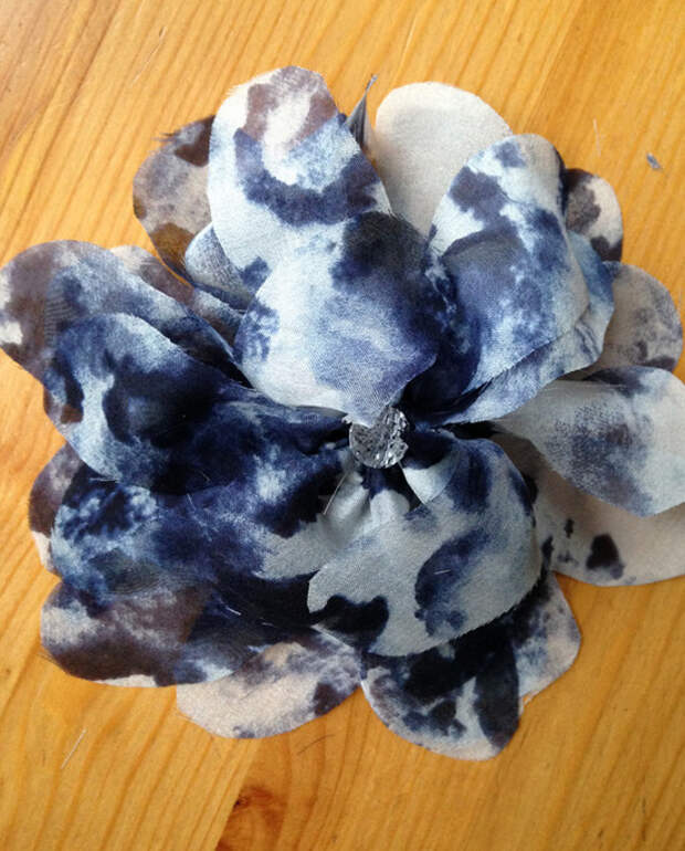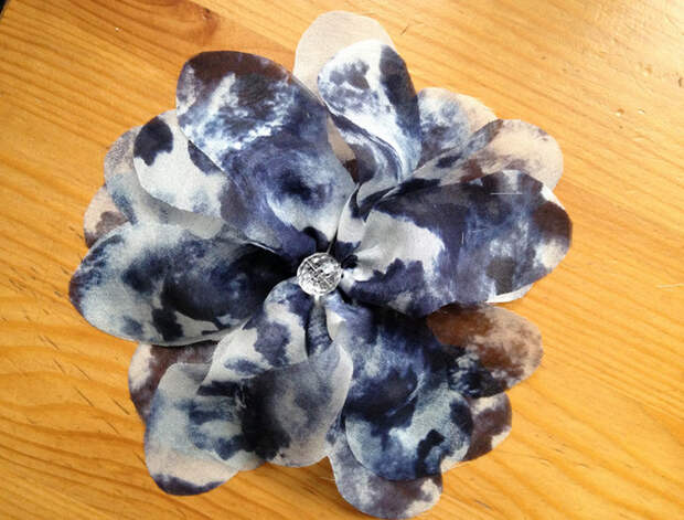 Этими чудесными объёмными цветами из ткани можно украшать практически всё: блузы, сумки, заколки, открытки, подарки, лампы, торты и пр. Они смотрятся очень нарядно и празднично, а шьются из остатков ненужной ткани. Конечно, хорошо бы выбрать ткань поярче и с рисунком – тогда будущий цветок получится действительно сказочным. Совсем необязательно брать ткань одного и того же цвета – как и было сказано, в таком цветке можно собрать несколько разноцветных лепестков, что будет смотреться очень необычно и интересно!