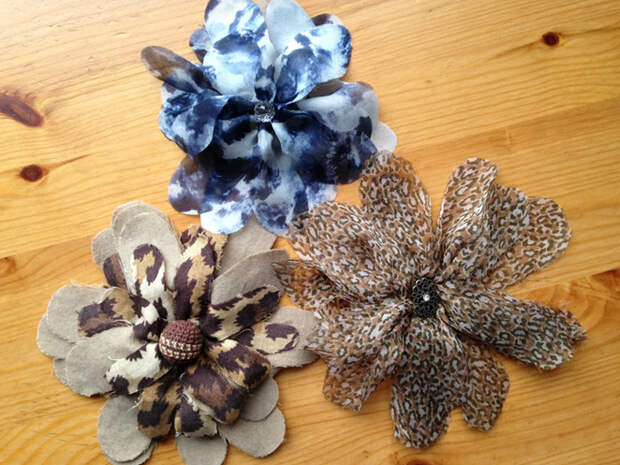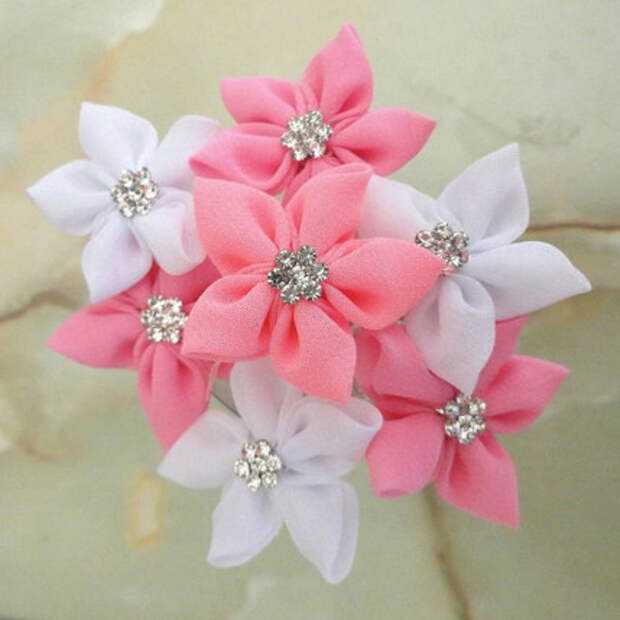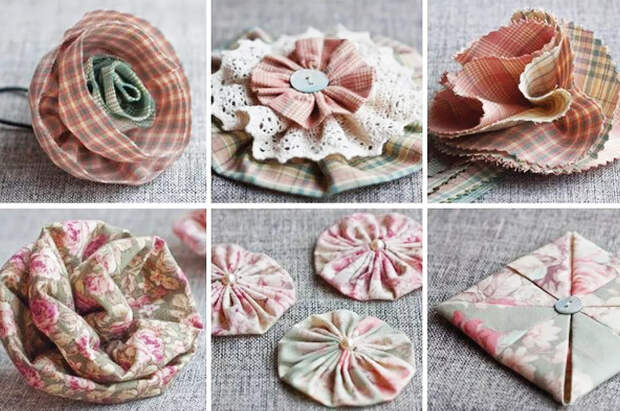 Вот какие замечательные, нежные и исключительно красивые цветы можно сделать из остатков ненужной ткани (при желании можно добавить бусины, блёстки, бисер, ленточки, камни и пр.):