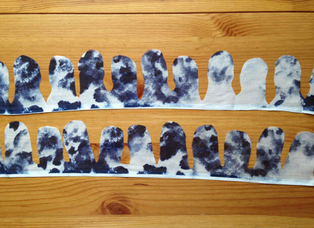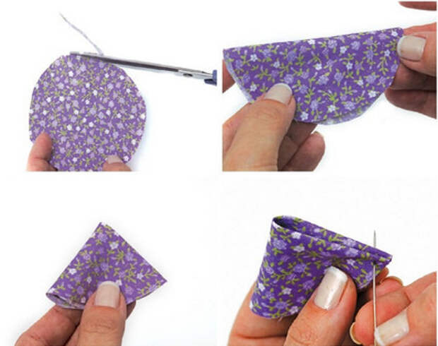 Разрежьте ткань на одинаковые кружочки. Сложите каждый кружок пополам (лицевой стороной наружу), затем ещё раз пополам. Начинаем собирать низ: