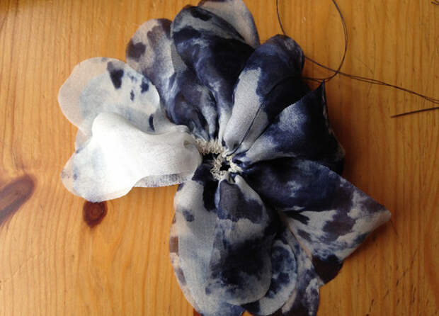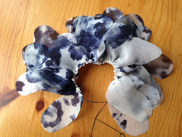 Повторяем предыдущие действия: нарезаем круги из однотонной ткани, дважды складываем пополам и собираем снизу. Проделываем то же самое и с тканью с рисунком, но здесь круги должны быть больше в диаметре в 1,5-2 раза. Собираем цветок: