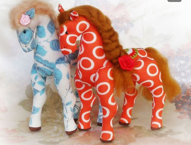 Зашиваем все отверстия, потайным швом. Нижний припуск ушек подворачиваем вовнутрь, подхватим потайным швом, затем складываем пополам и сошьем стежками. Ушки пришить симметрично к голове. Ножки пришить потайным швом, каждую по два раза, для устойчивости лошадки.